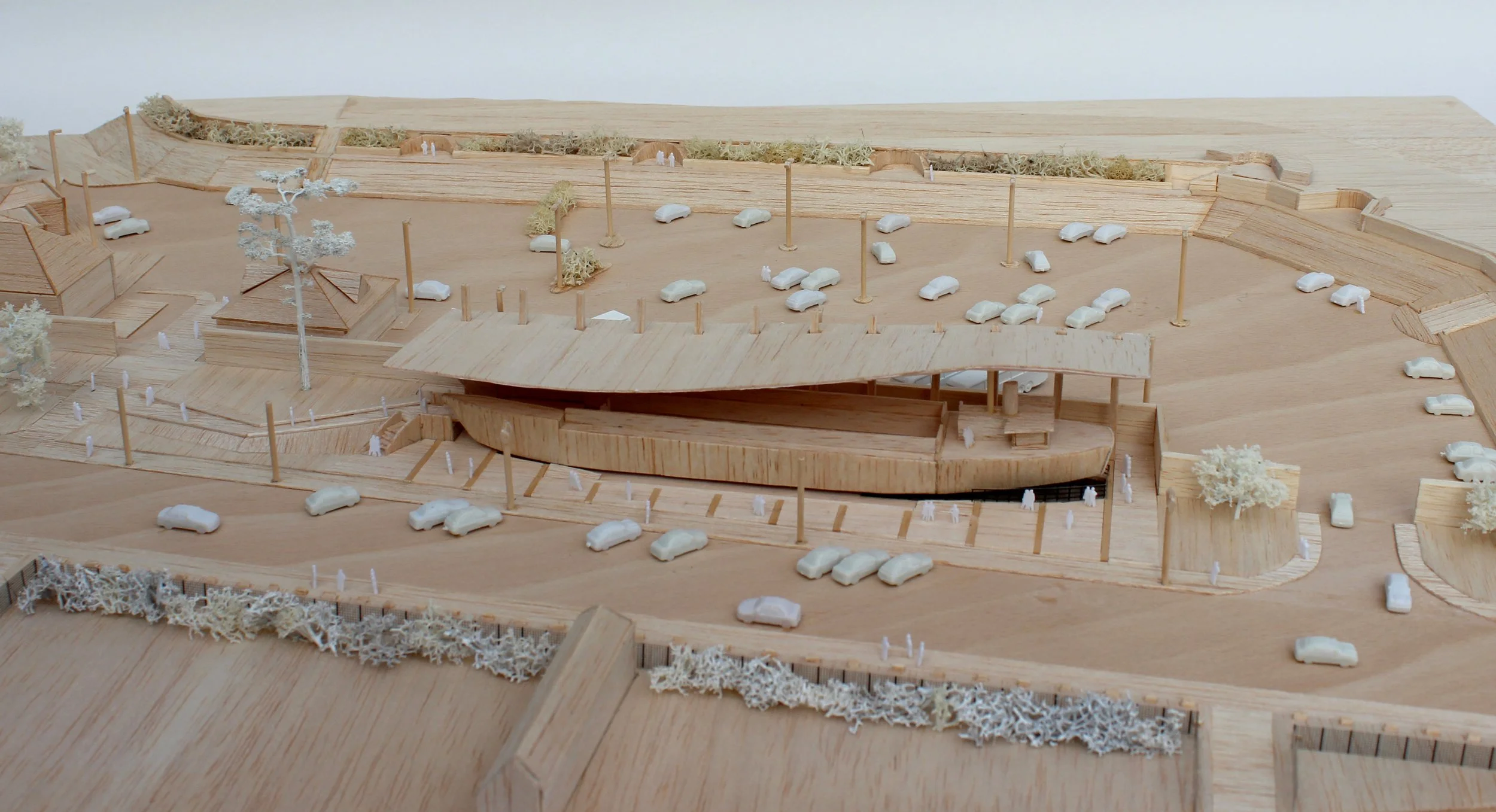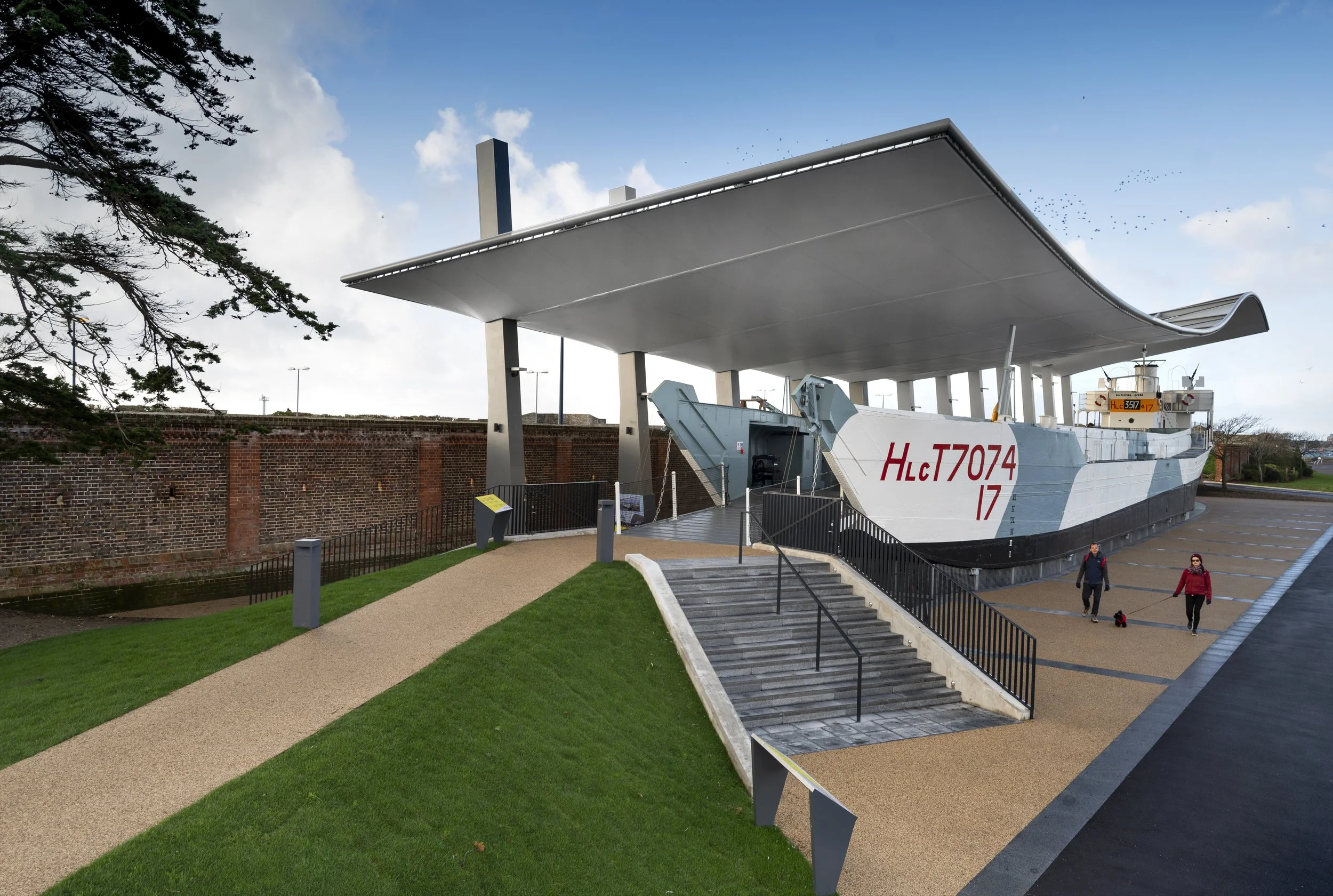 As architects for the project, Pritchard Architecture were responsible for the contemporary new canopy and the surrounding landscape which has created a welcoming visitor entrance that connects both physically and materially with the adjacent D-Day Story museum and makes LCT7074 part of the public realm. A strong rhythm of steel columns that relate to the piers of the historic wall behind, support a sweeping cantilevered canopy, keeping one side of the ship clear of visual distraction and providing clear uninterrupted views of LCT 7074 from Southsea Common. The form of the canopy follows the shape of LCT 7074, starting lower at the bow end of the ship, sweeping over the tank deck before rising sharply over the ship’s bridge and funnel and then dropping back down at the stern. The canopy maintains a simplicity that is sympathetic to its sensitive surroundings while still having a presence that physically relates to the robustness and mass of the ship itself.